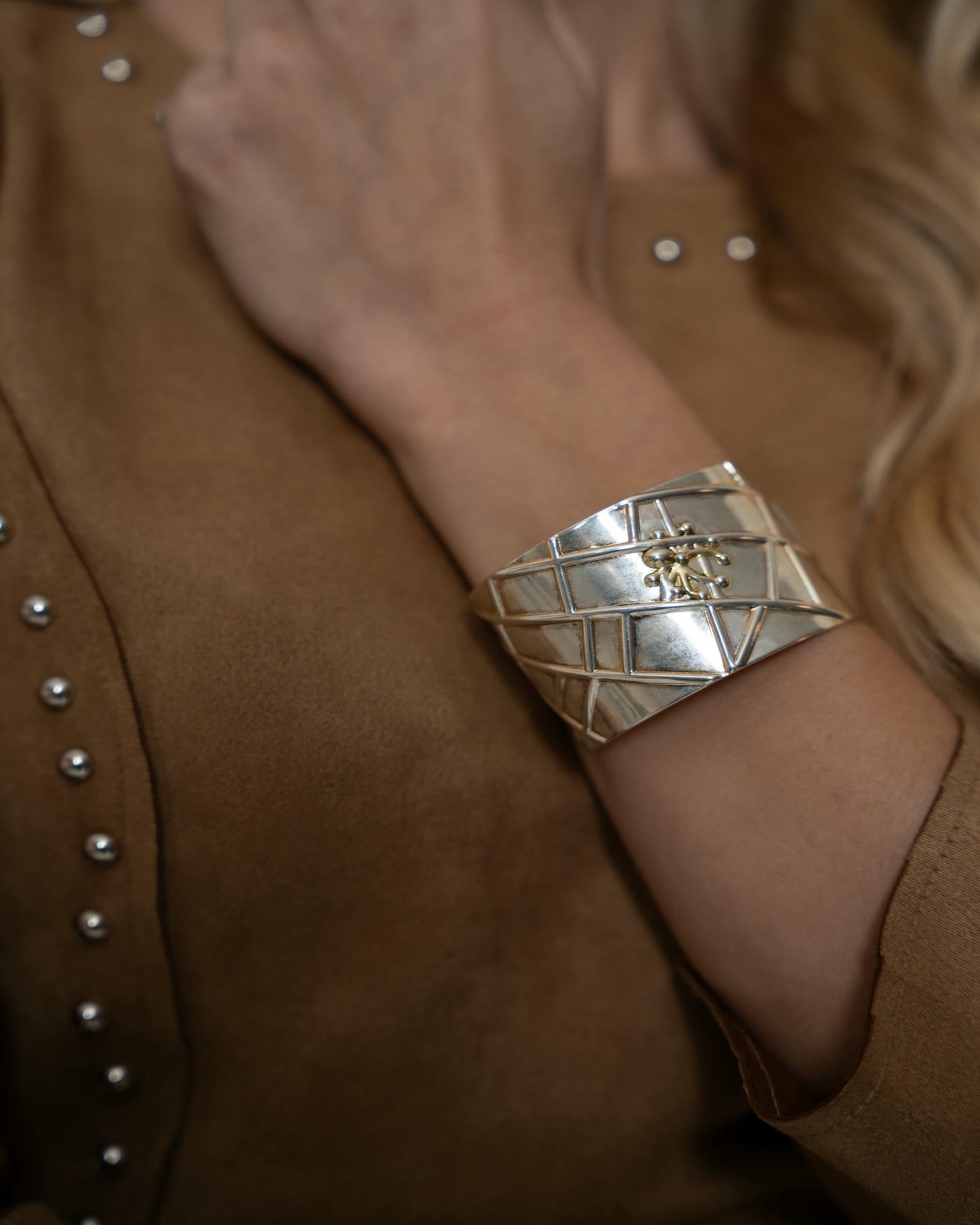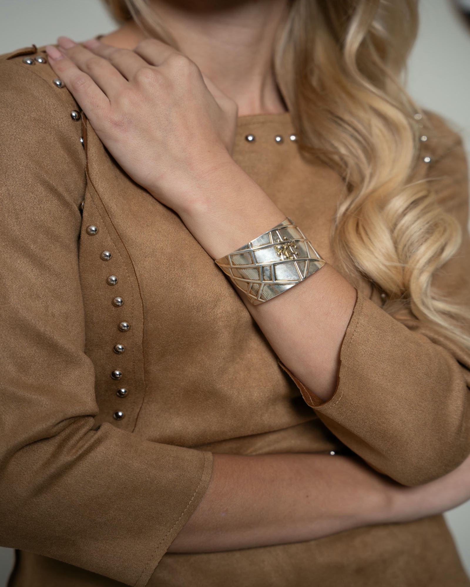 سوار المتاهة المذهب تحفة فنية معمارية مصممة للجرأة والأناقة. مصنوع من سبيكة ذهبية مصقولة، يتميز هذا السوار العريض بتصميم شبكي متقن ومفتوح يأسر الضوء والظل مع كل حركة. تصميمه المنحوت يجسد القوة والانسيابية، مما يجعله القطعة المثالية للأناقة العصرية.